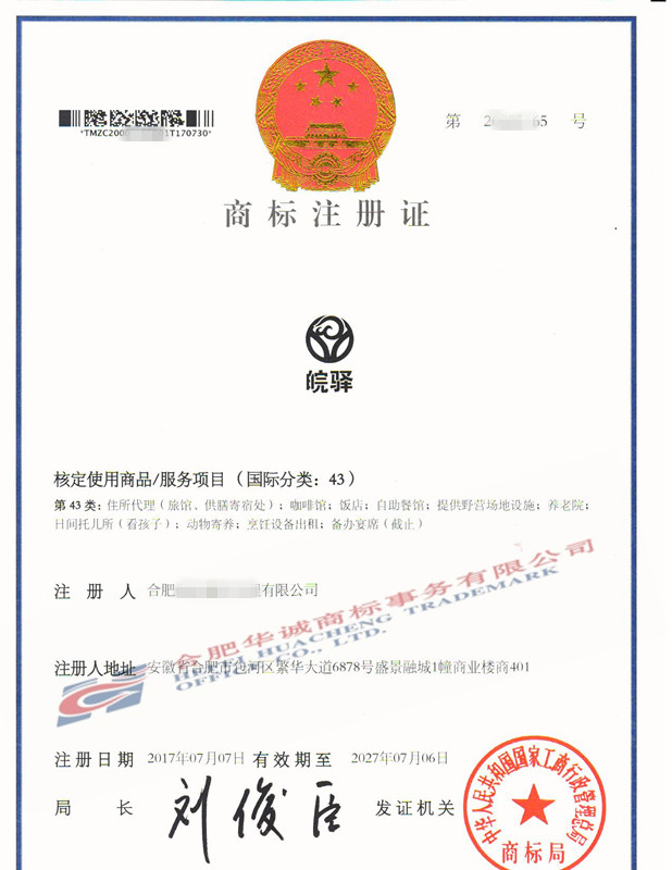 您委托我所代理商标注册申请,名称为“皖驿”43类商标注册证已下达。