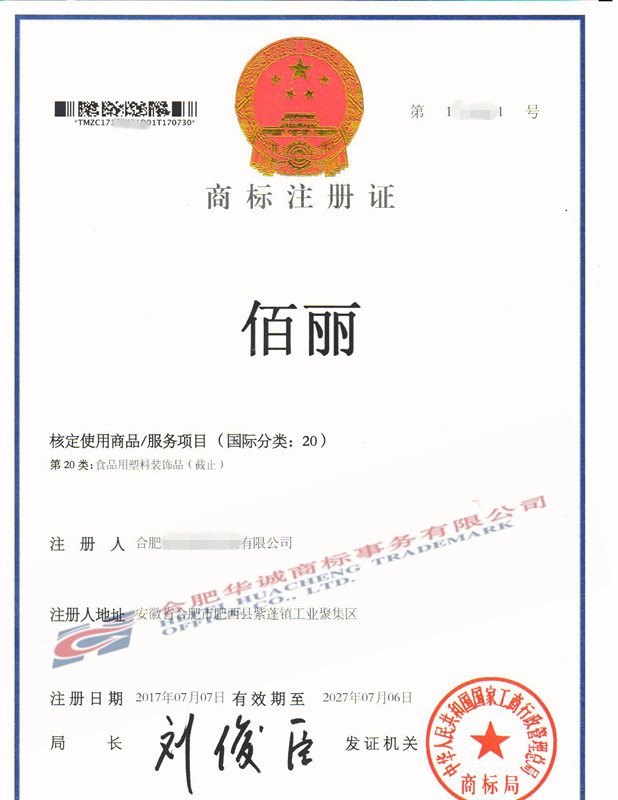 您委托我所代理商标注册申请,名称为“佰丽”20类商标注册证已下达。