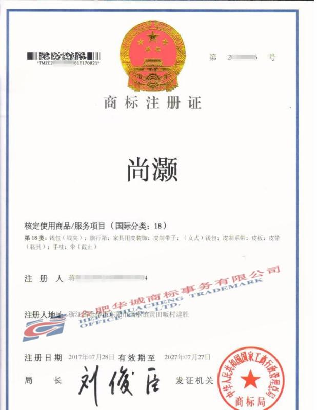 您委托我所代理商标注册申请,名称为“尚灏” 18类商标注册证已下达。