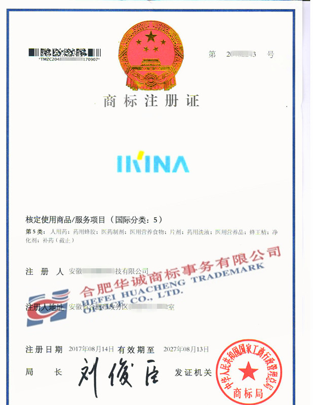 您委托我所代理商标注册申请,名称为“IKINA” 5类商标注册证已下达。