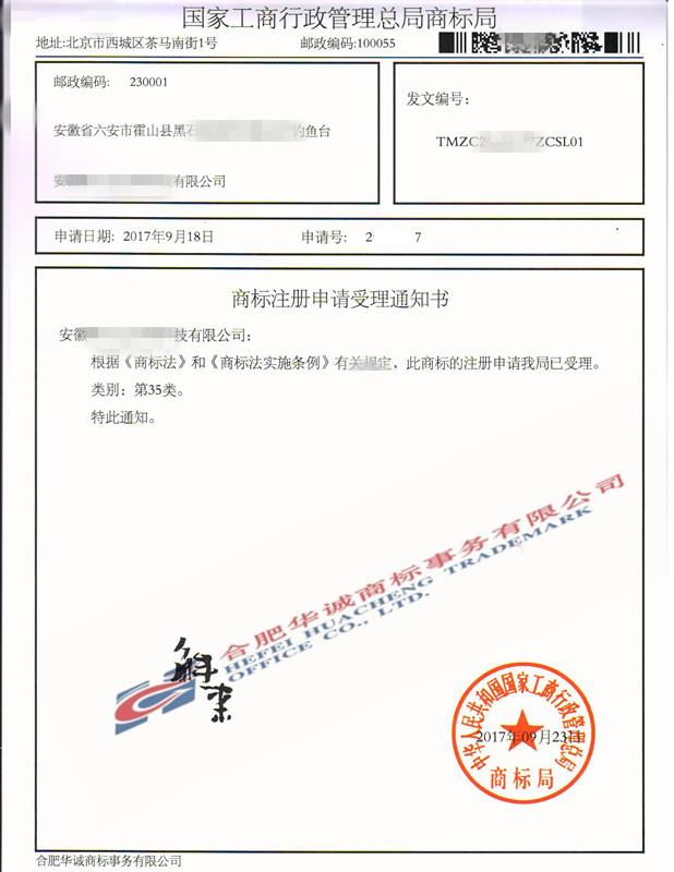 您委托我所代理商标注册申请,名称为“斛来”35、38、43类商标已被国家商标局受理。