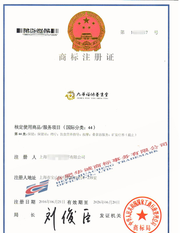 您委托我所代理商标注册申请,名称为“九华福地养生堂” 44类商标注册证已下达。