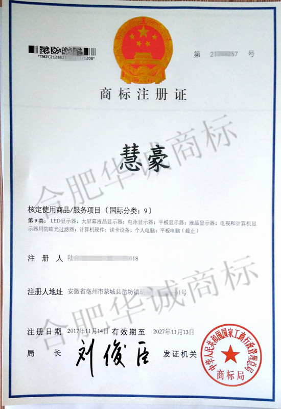 您委托我所代理商标注册申请,名称为“慧豪” 9类商标注册证已下达。