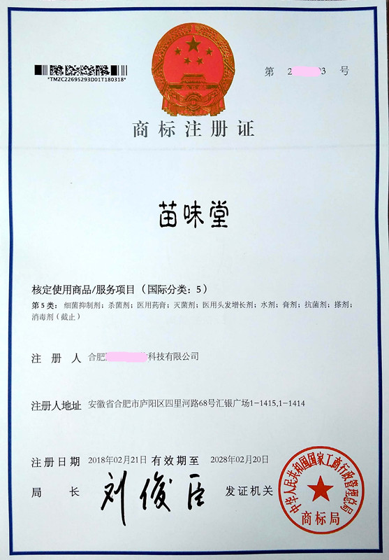 您委托我所代理商标注册申请,名称为“苗味堂”3类、5类商标注册证已下达。