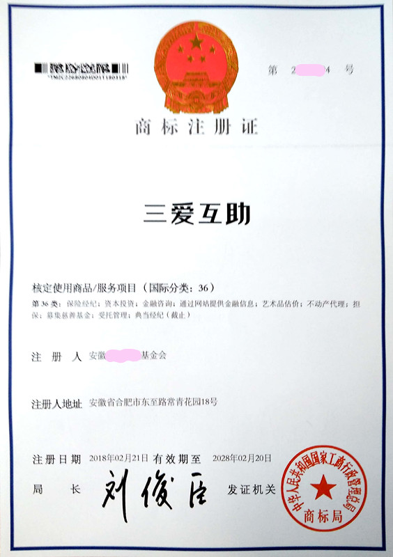 您委托我所代理商标注册申请,名称为“三爱互助”35类、36类商标注册证已下达。