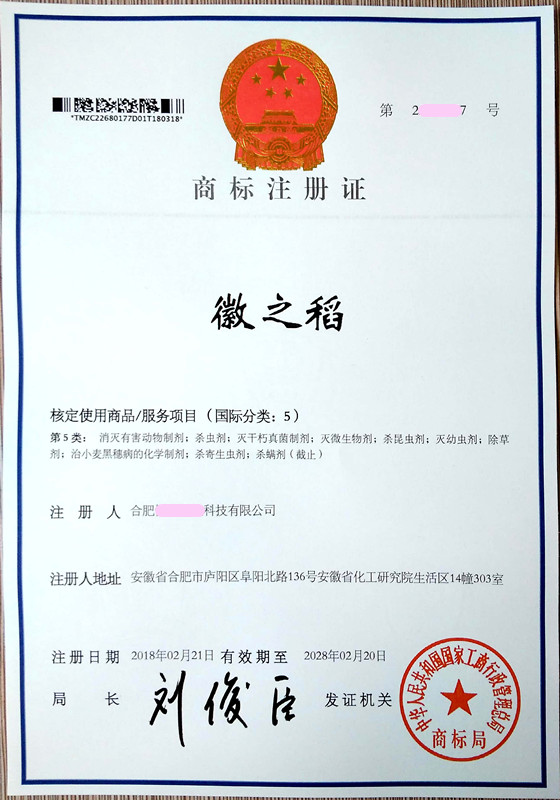 您委托我所代理商标注册申请,名称为“徽之稲”5类商标注册证已下达。