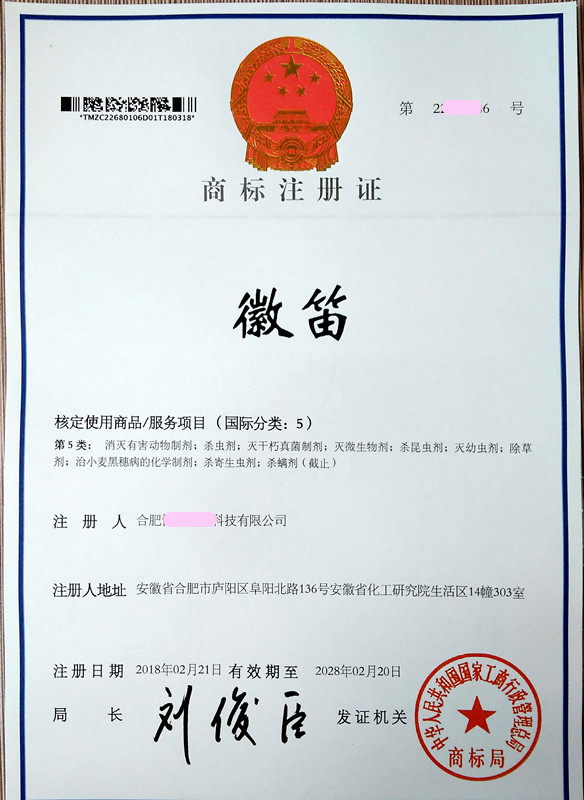 您委托我所代理商标注册申请,名称为“徽笛”5类商标注册证已下达。