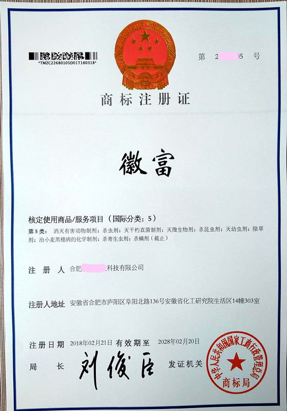 您委托我所代理商标注册申请,名称为“徽富”5类商标注册证已下达。