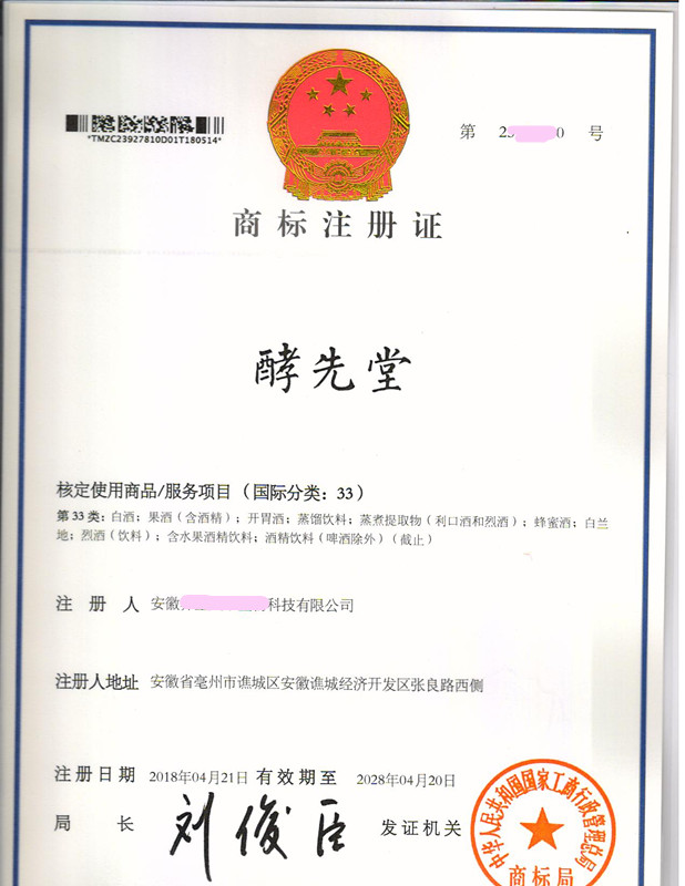 “酵先堂”33类商标注册证下达