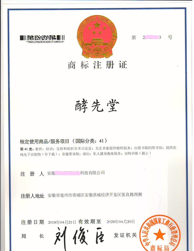 您委托我所代理商标注册申请,名称为“酵先堂”41类商标注册证已下达。