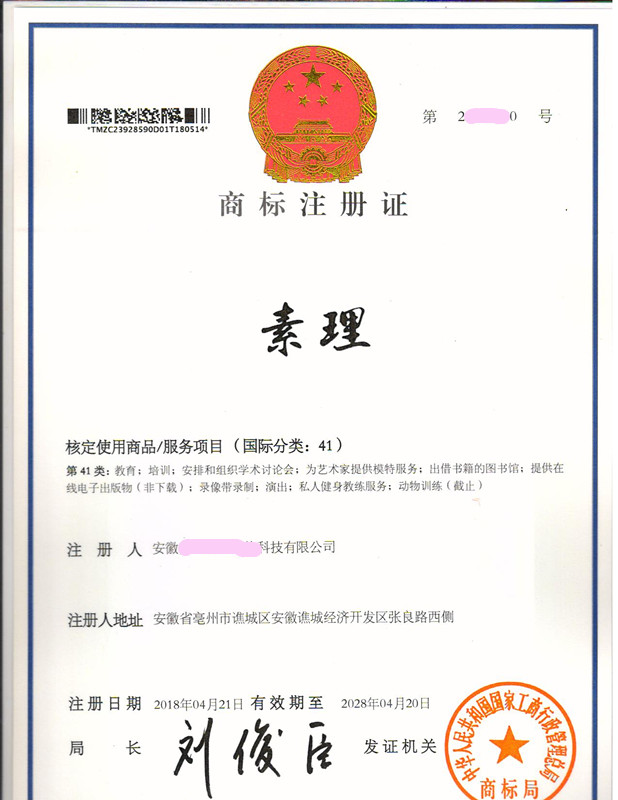 “素理”41类商标注册证下达