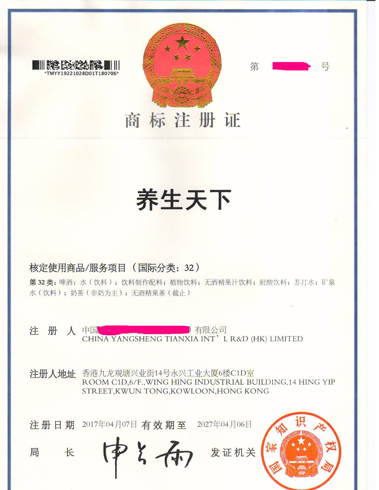 您委托我所代理商标注册申请,名称为“养生天下”32类商标注册证已下达。