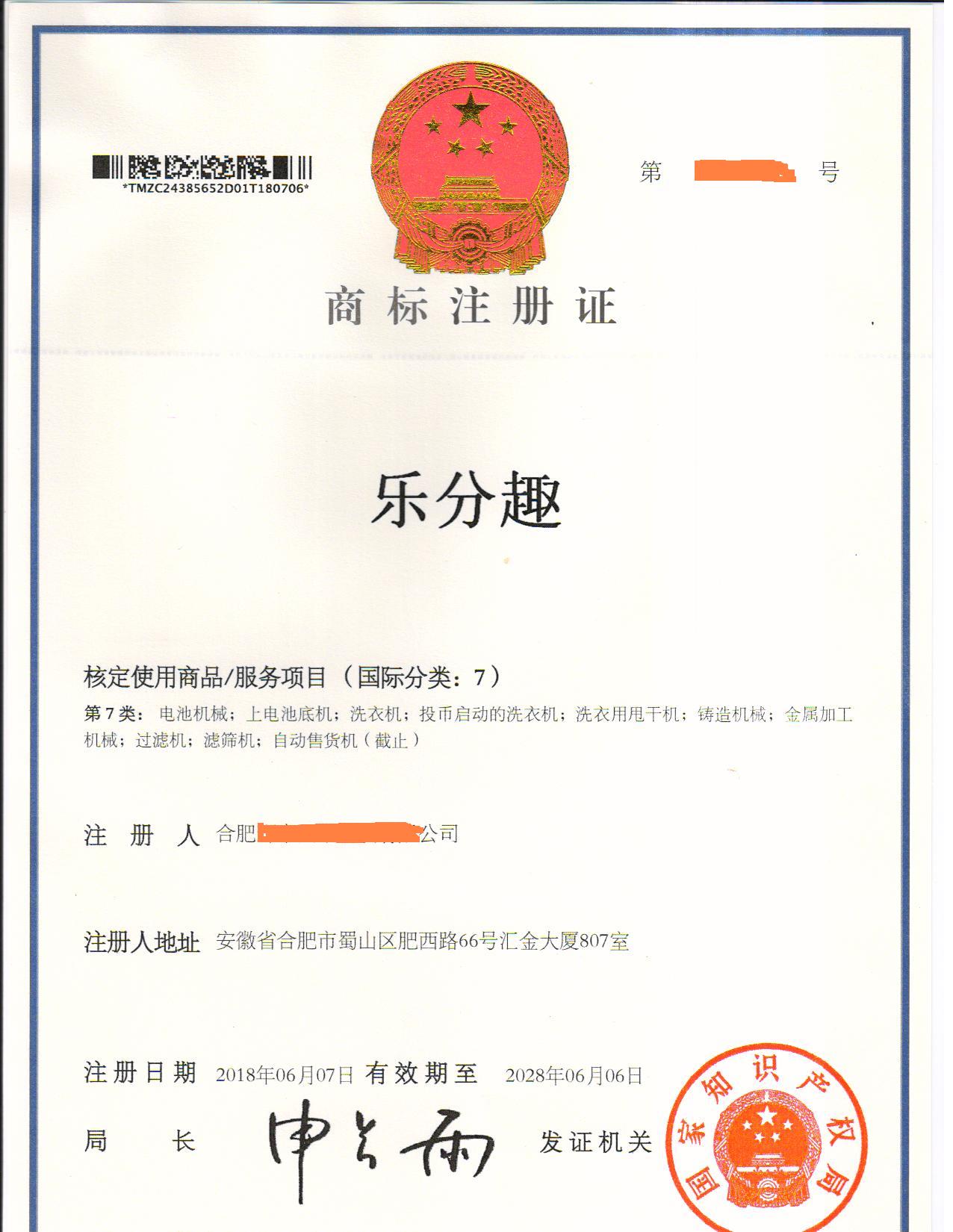 您委托我所代理商标注册申请,名称为“乐分趣”7类商标注册证已下达。