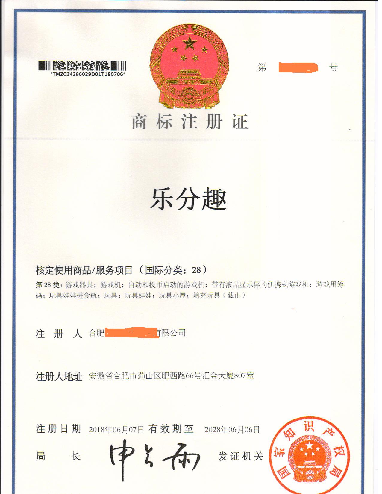 您委托我所代理商标注册申请,名称为“乐分趣”28类商标注册证已下达。