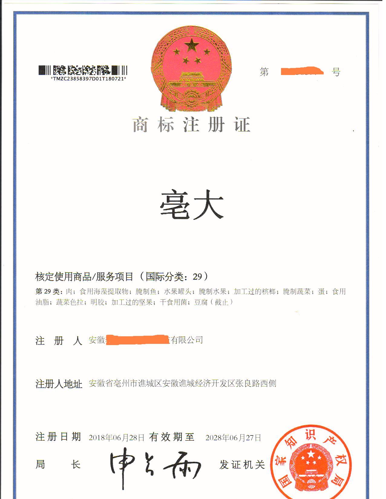您委托我所代理商标注册申请,名称为“亳大”29类商标注册证已下达。